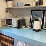 Hier wird eine voll ausgestattete Küche mit einem Kochfeld und Küchenutensilien angeboten. Dieses Apartment hat auch eine Terrasse mit Blick auf die Stadt.